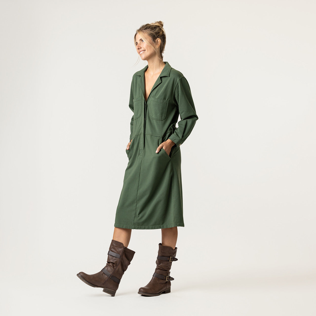 The Workwear Dress is made from soft fleece with a mid-calf length for all-day comfort. Designed with chest and side pockets, belt loops, and a hidden button at the neck. Garment dyed for a lived-in look that feels effortless.
